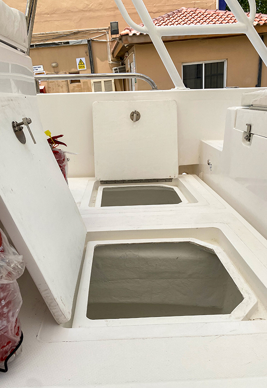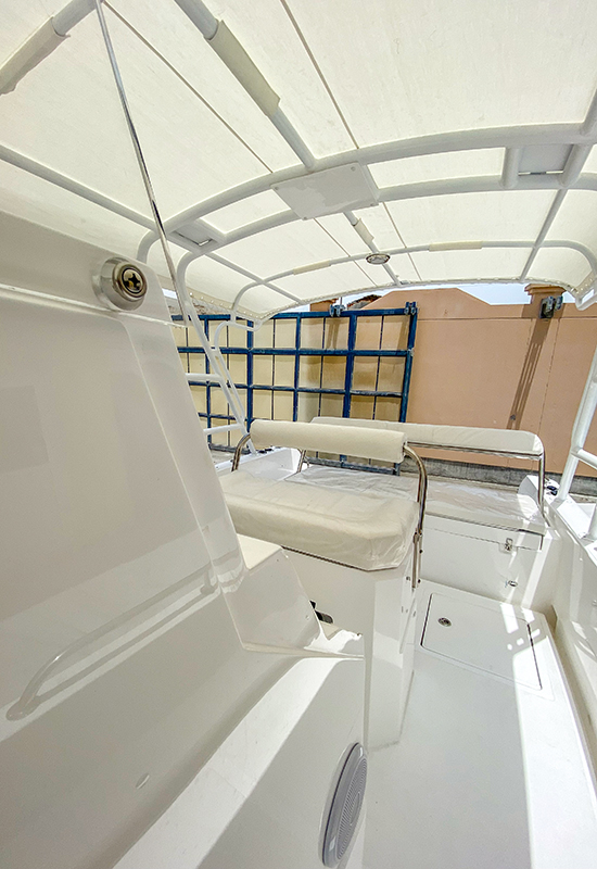- 6. 2 person GRP helm seat with storage, and white cushions with backrest/ supports are stainless steel
