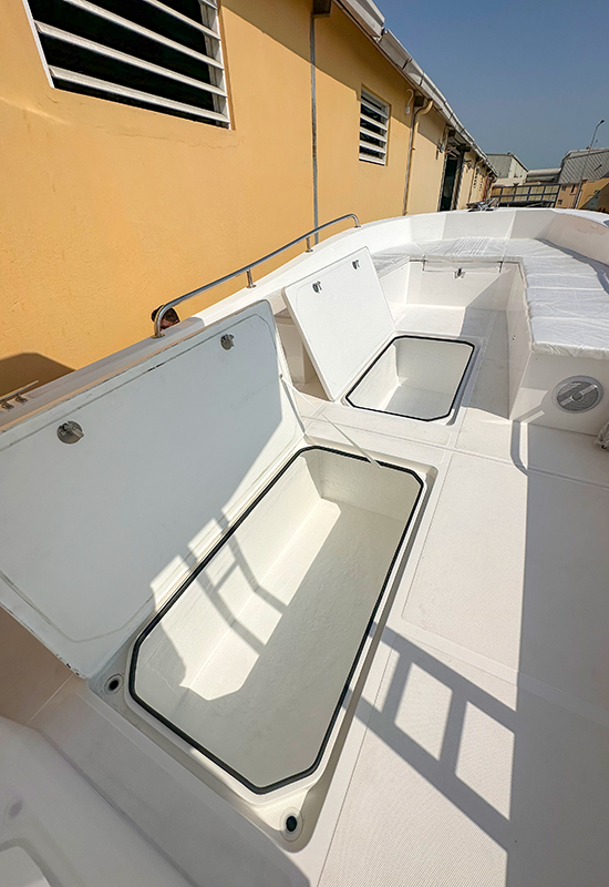 - Aft Storage seat with stainless steel movable backrest and locker with white cushions