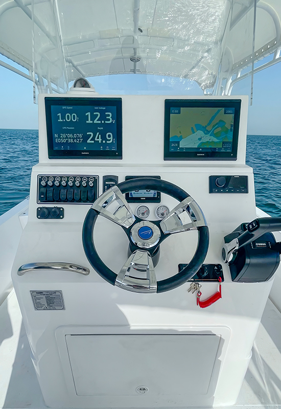 - Garmin 7" GPS on helm with blue chart