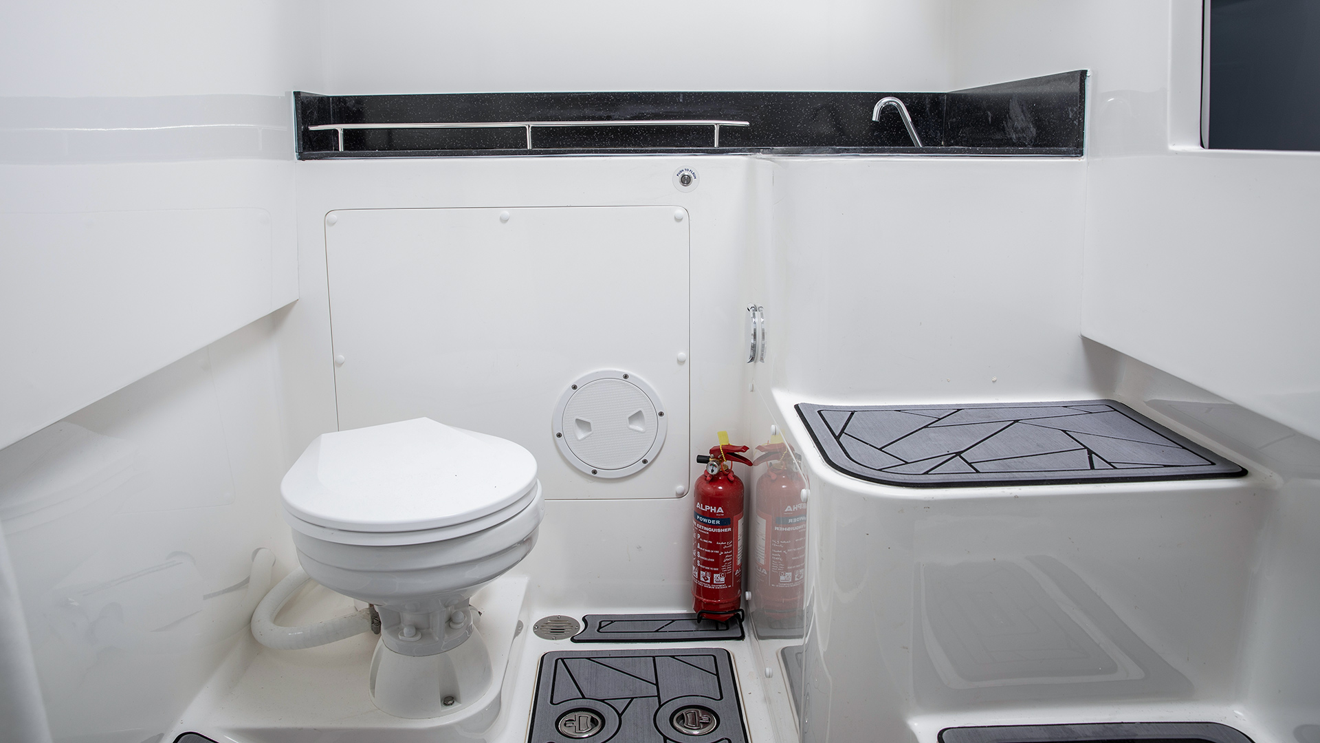 on bilge compartment (high water alarm) with 1 x 1500 GPH in bilge compartment (Auto bilge pump) - Fresh water electric toilet (direct overboard)