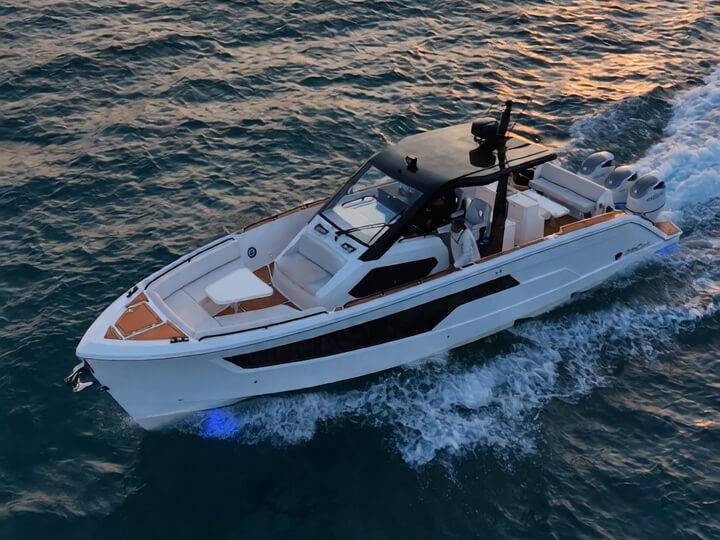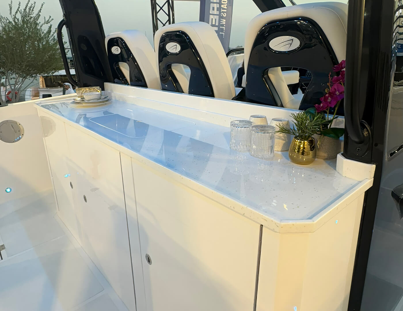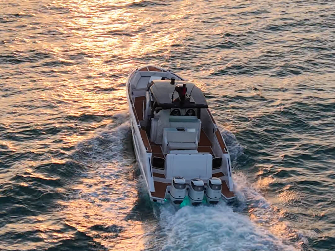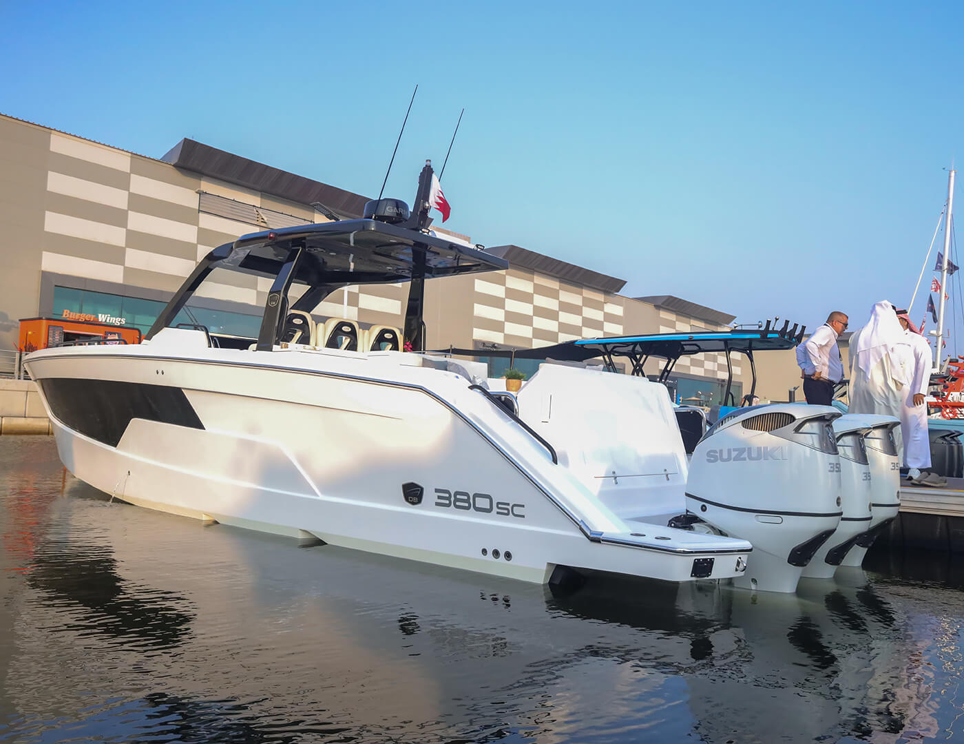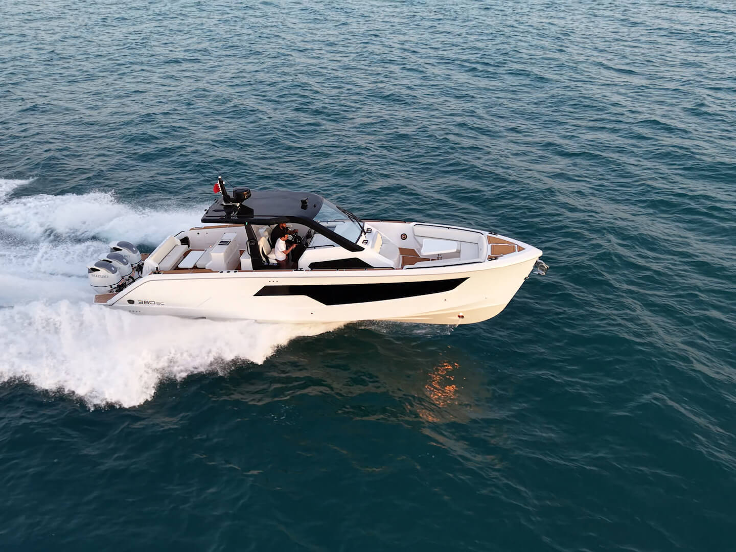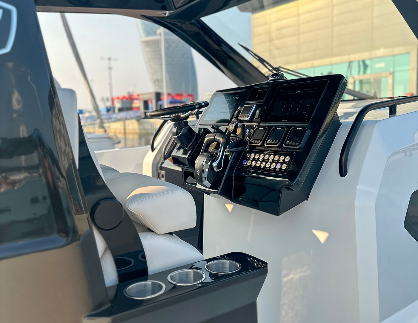 The DB 380SC embodies Al Dhaen Boats’ commitment to innovative design and refined craftsmanship, distinguished by its contemporary hull form and signature lines and shape that blend performance with enduring elegance. Its intelligently designed modular cockpit creates a versatile social space—ideal for entertaining, relaxing on the water, or enjoying a spirited run toward the open horizon. The helm is equipped with three ergonomic seats and a state-of-the-art Garmin navigation system featuring dual 12-inch displays, ensuring confidence and control at every speed. Behind the cockpit, the space is thoughtfully utilized with a fully equipped wet bar, offering a customizable large sink, refrigerator, electric stove, and generous storage throughout. Foldable seating areas further enhance onboard flexibility, transforming the deck into a welcoming outdoor retreat. Below deck, the DB 380SC features a well-appointed cabin with a convertible seating area that transforms into a comfortable bed, a fully equipped toilet, and a compact galley, providing all the essentials for extended day trips or overnight stays.