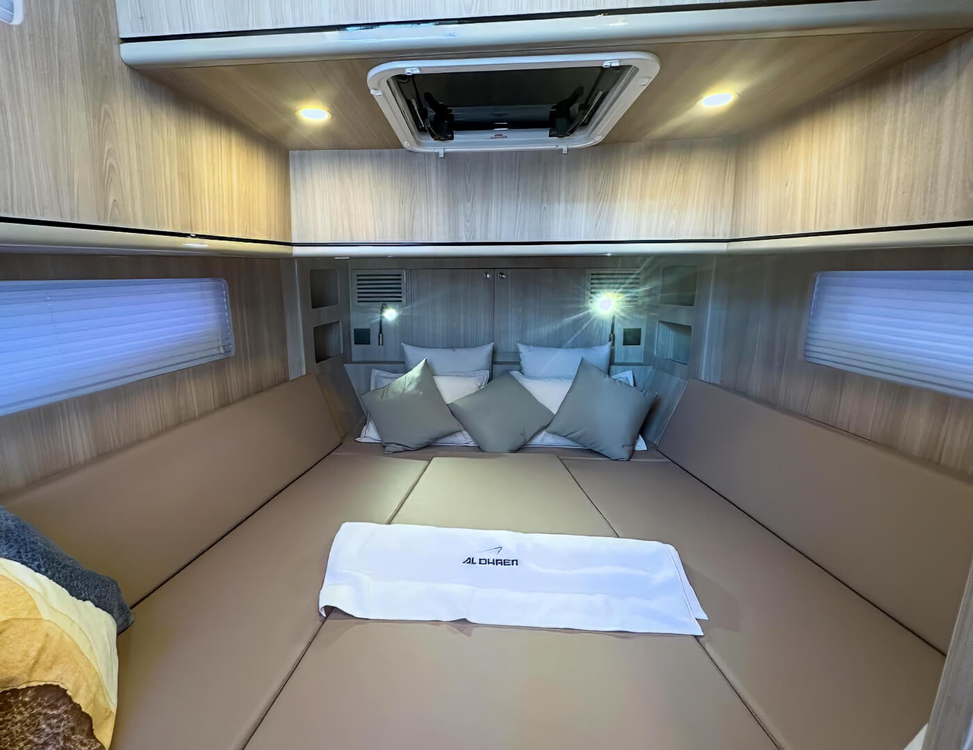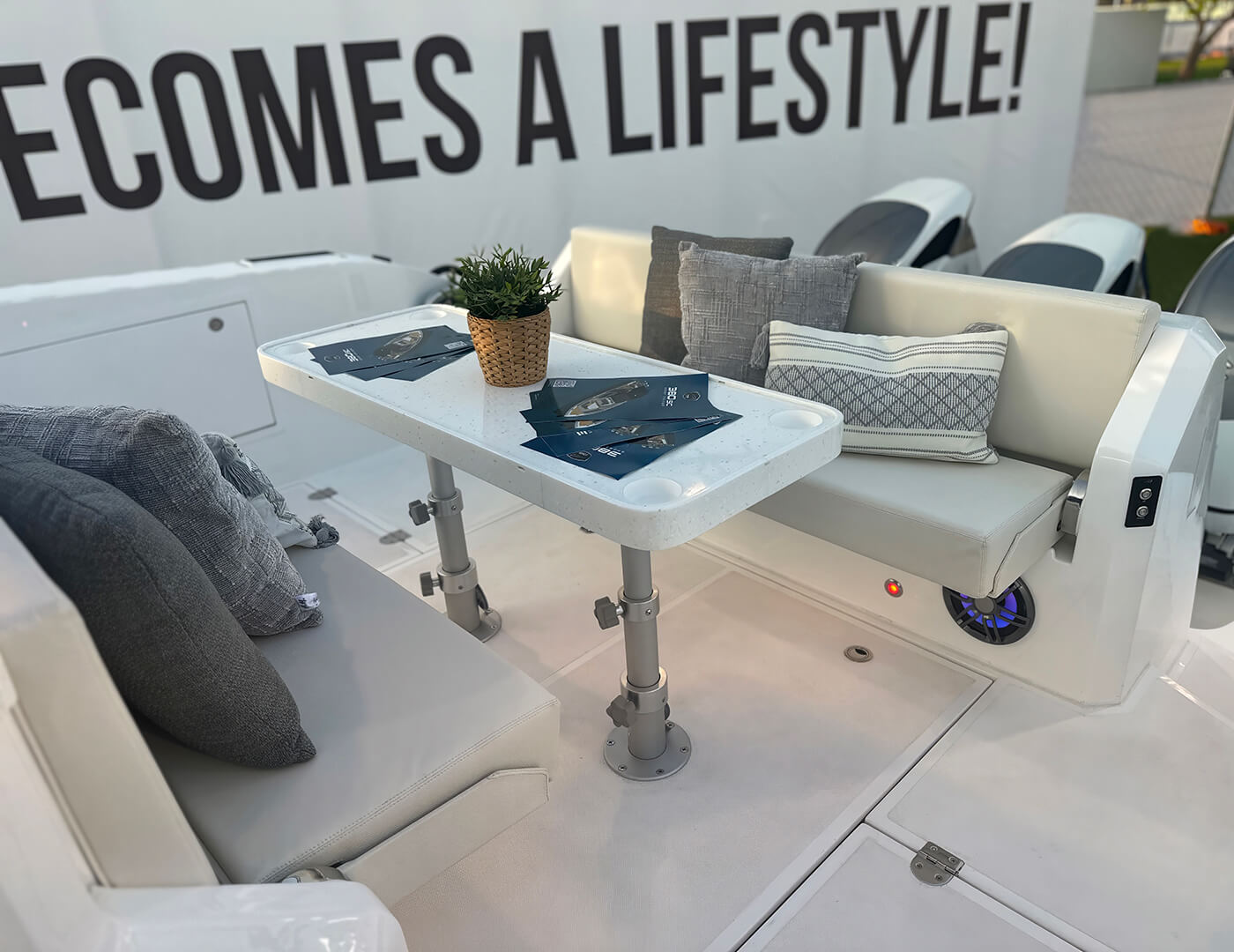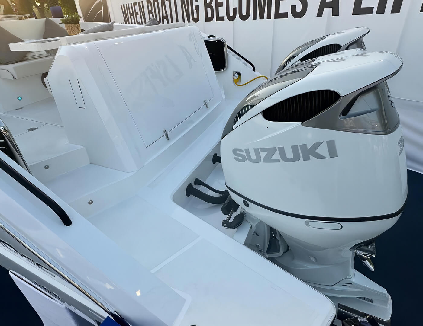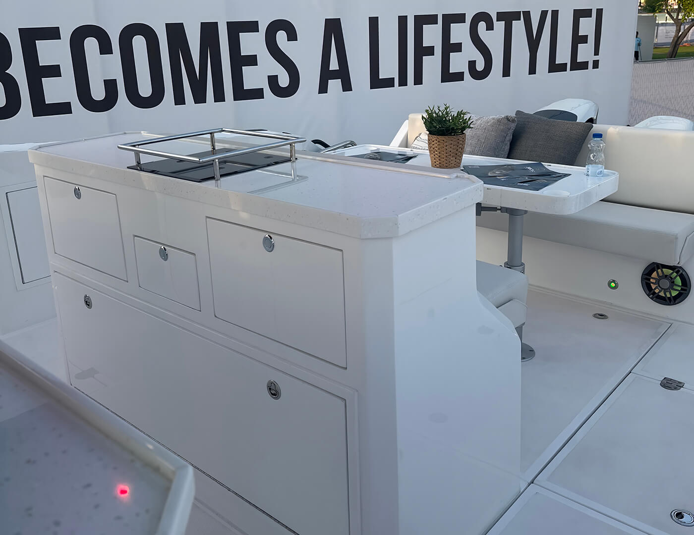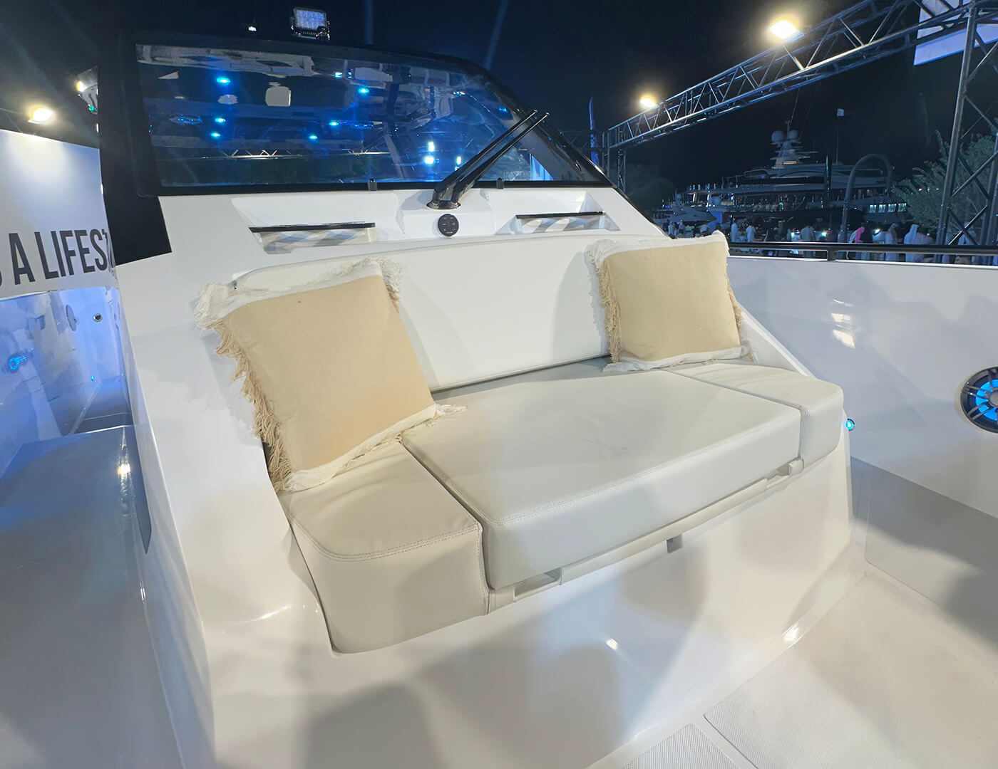 The DB 380SC embodies Al Dhaen Boats’ commitment to innovative design and refined craftsmanship, distinguished by its contemporary hull form and signature lines and shape that blend performance with enduring elegance. Its intelligently designed modular cockpit creates a versatile social space—ideal for entertaining, relaxing on the water, or enjoying a spirited run toward the open horizon. The helm is equipped with three ergonomic seats and a state-of-the-art Garmin navigation system featuring dual 12-inch displays, ensuring confidence and control at every speed. Behind the cockpit, the space is thoughtfully utilized with a fully equipped wet bar, offering a customizable large sink, refrigerator, electric stove, and generous storage throughout. Foldable seating areas further enhance onboard flexibility, transforming the deck into a welcoming outdoor retreat. Below deck, the DB 380SC features a well-appointed cabin with a convertible seating area that transforms into a comfortable bed, a fully equipped toilet, and a compact galley, providing all the essentials for extended day trips or overnight stays.