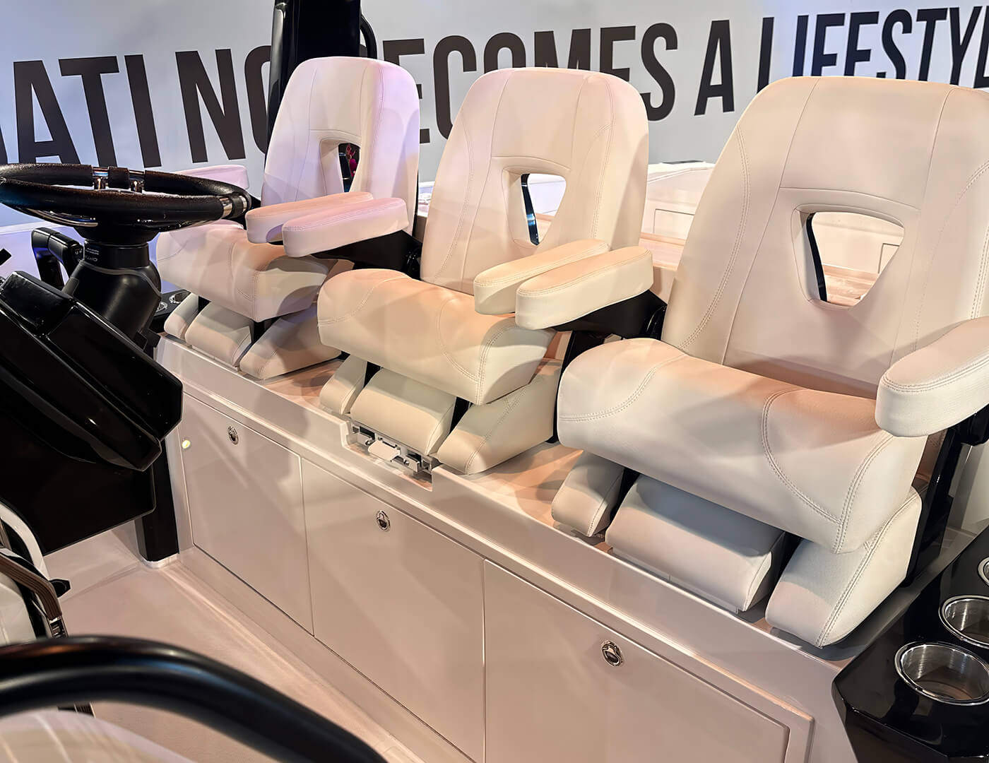 - Three individual passenger seats with backrest mounted on GRP seat base, Pilot seat is adjustable type