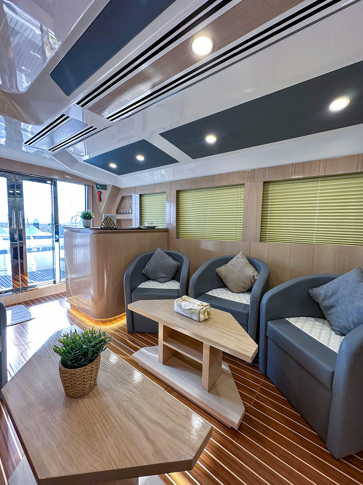 • Sliding aluminum frame window at foredeck Port & STBD side (captain seat), 3 x fixed aluminum framed window at front (all saloon windows in grey tempered glass with Romanian style curtains Port & STBD))