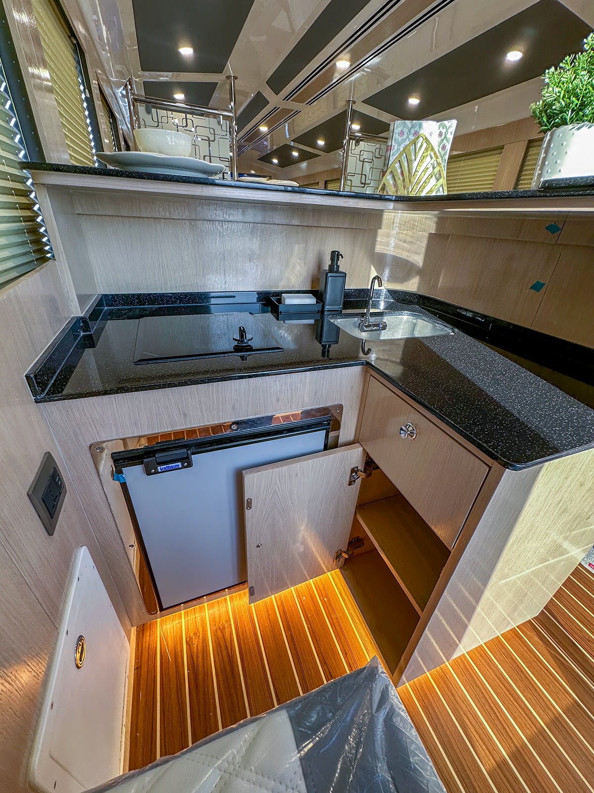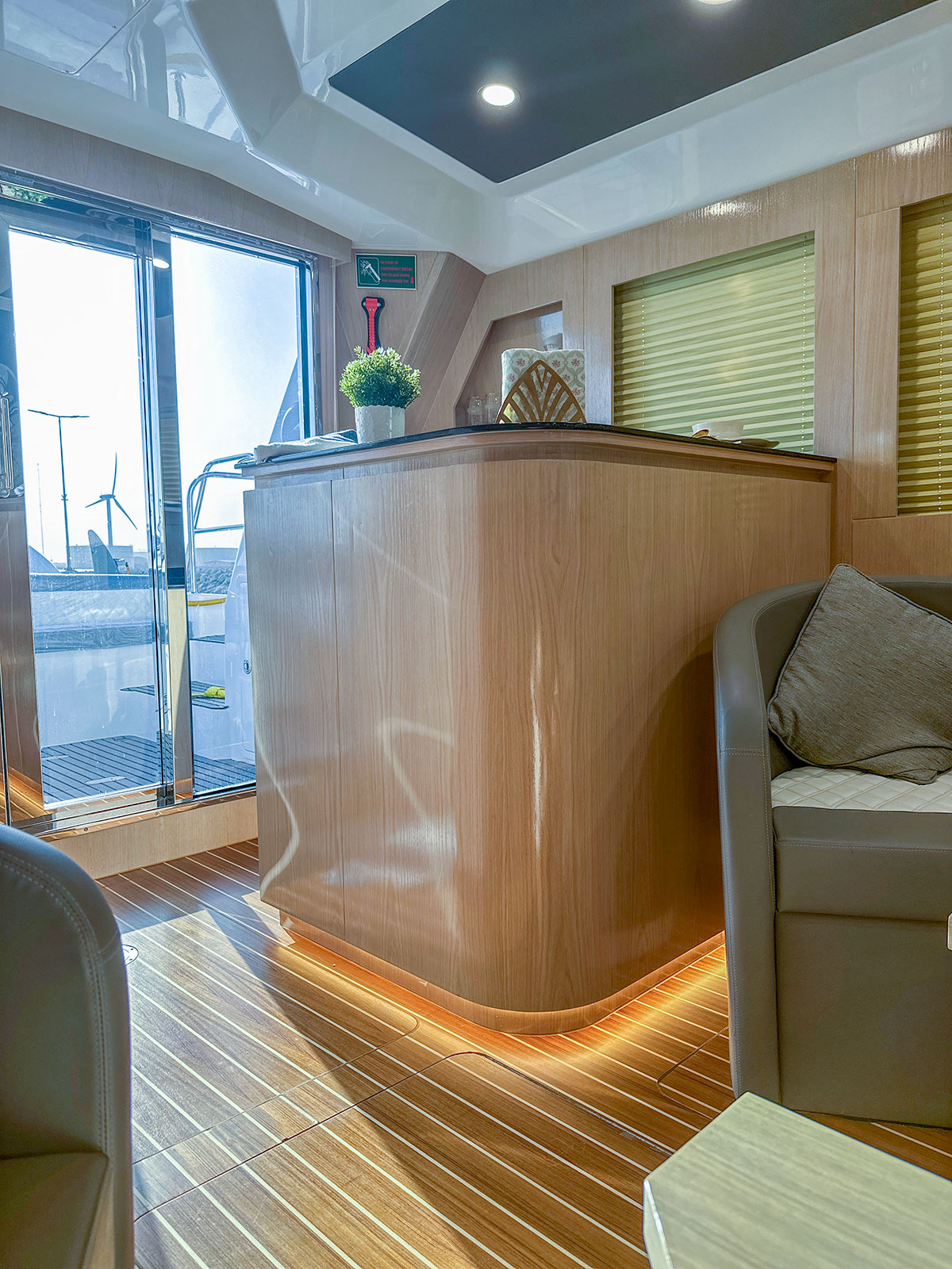 • Wet bar in port side with corian top and drawers underneath, sink and small foldable chair with cushion