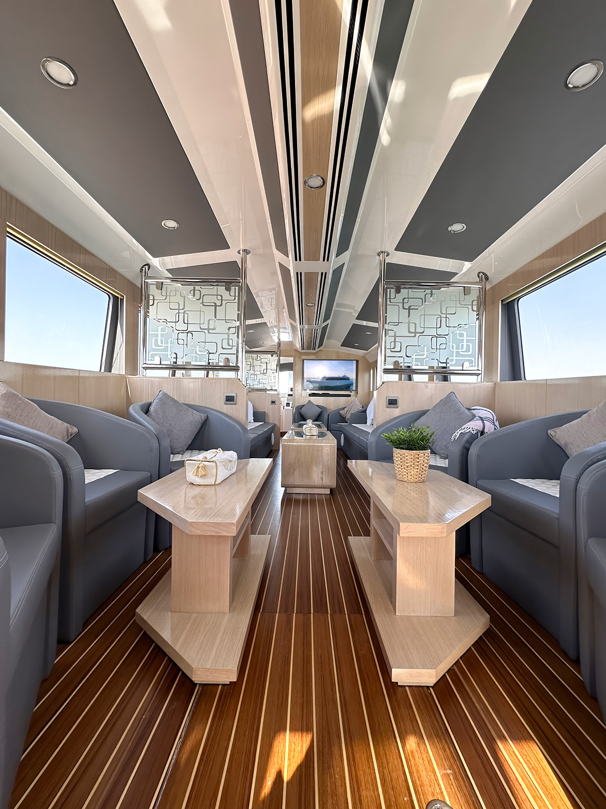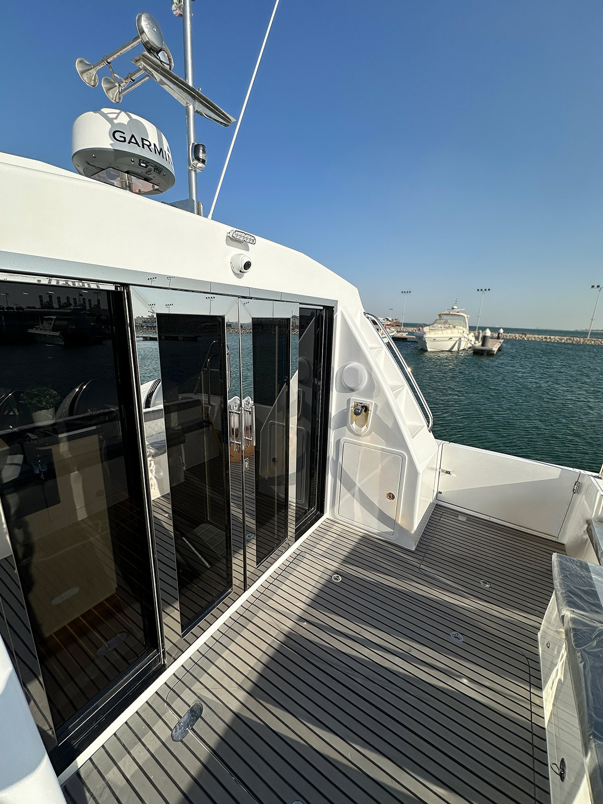 • 3 x Stainless steel partition with frosted glass and wood base (one forward in port side & two Aft (one port & one STB)
