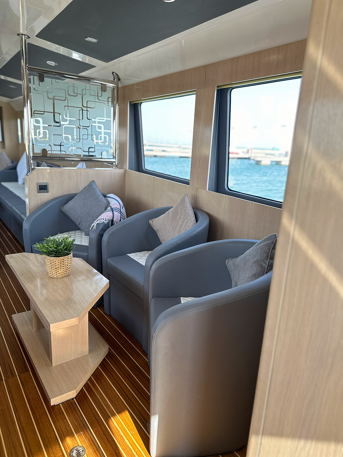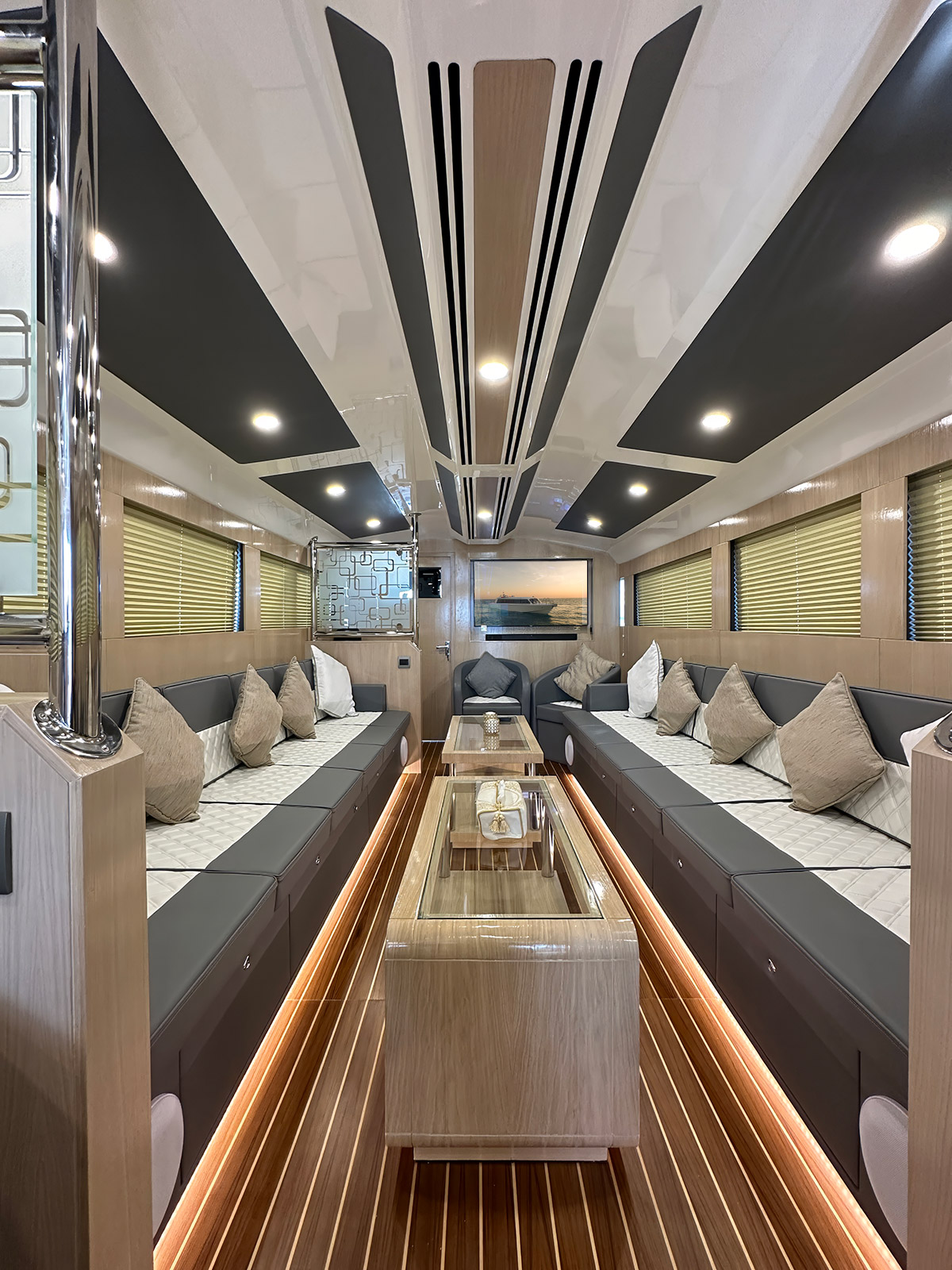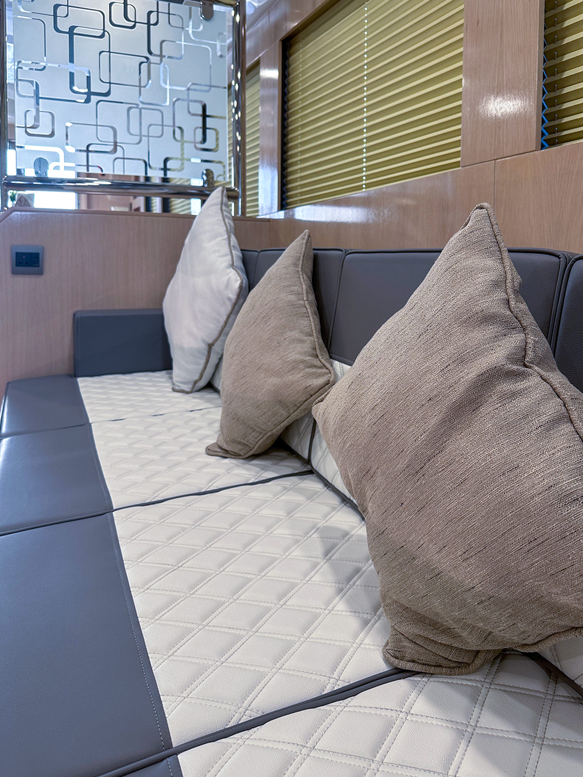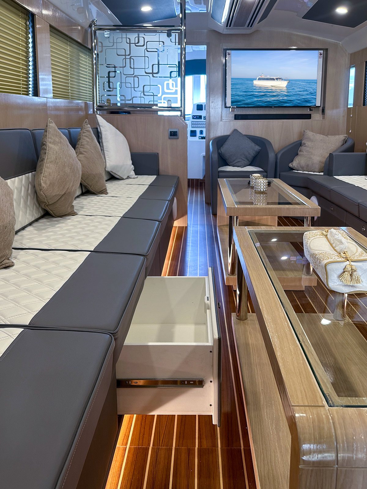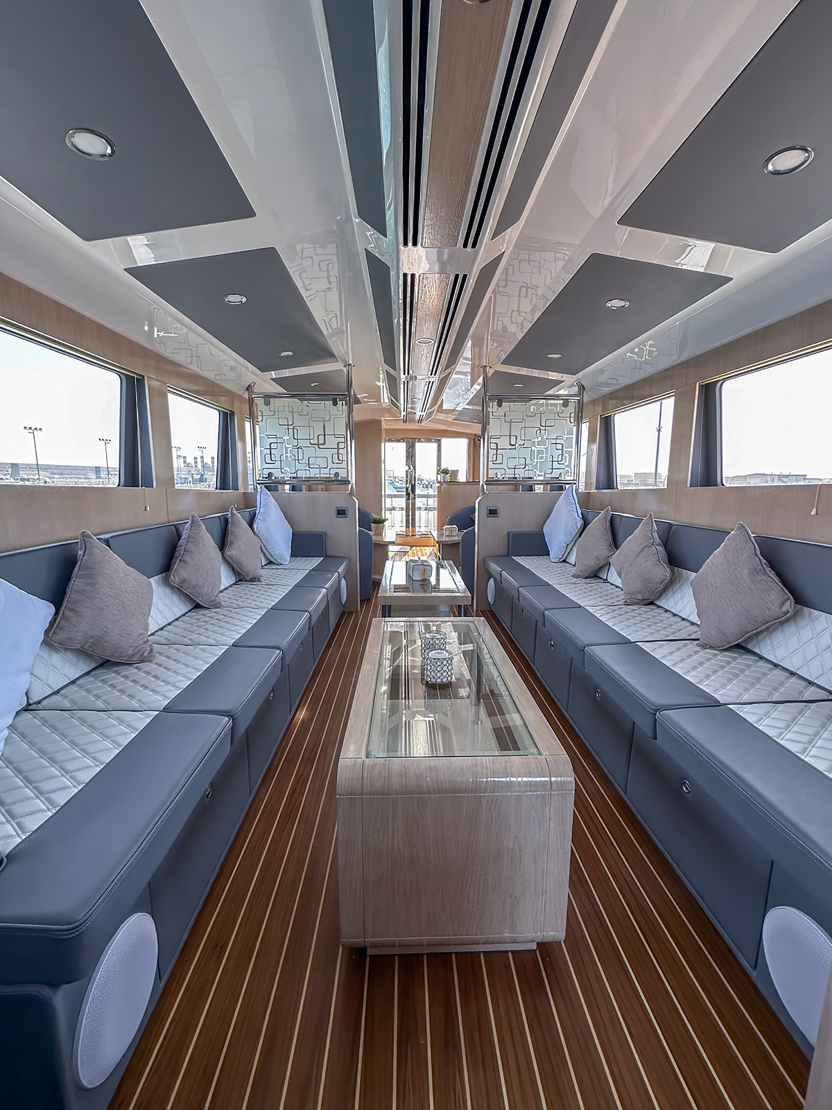 • Saloon sofa for 6 persons each side (Port & STBD) with luxury upholstery & 16 throw pillows (8 small & 8 big) colour TBC