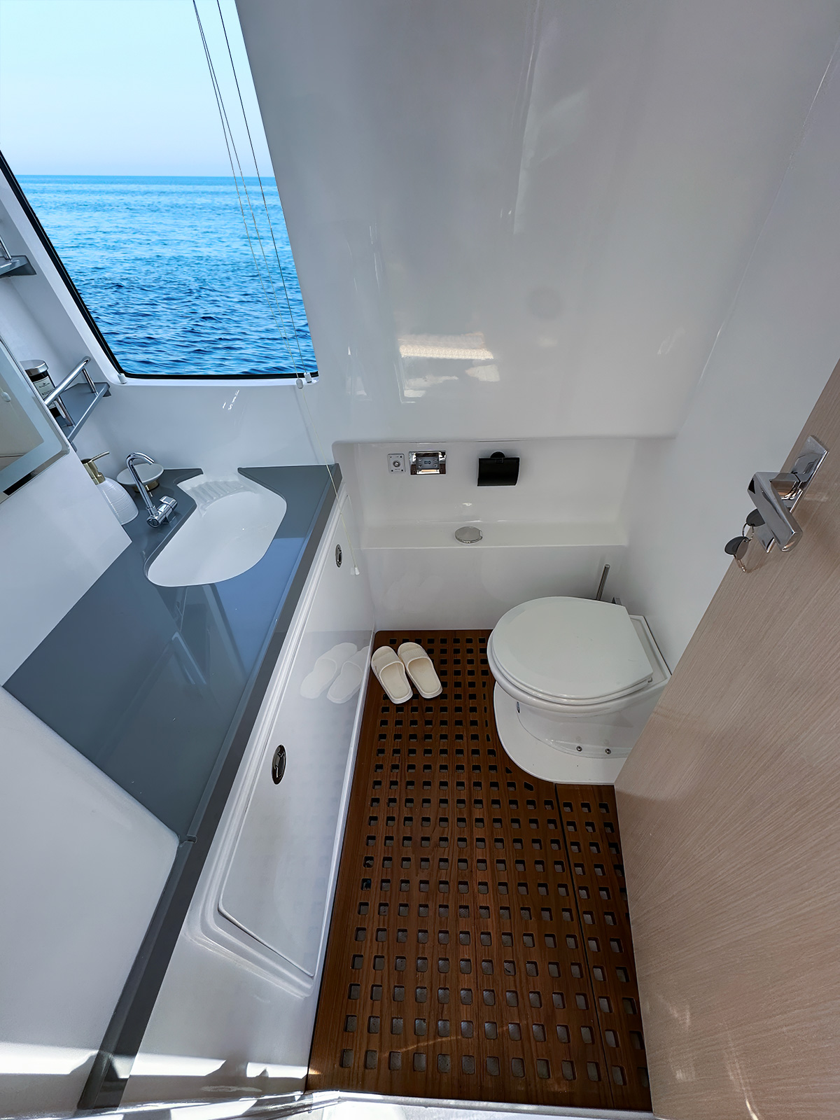 • Bathroom in STBD side with teakwood flooring,Electric toilet, shower, corian top sink, wash basin,cool ventilation/exhaust fan, mirror with strip light, tissue holder, towel holder, two shelf with stainless steel rail